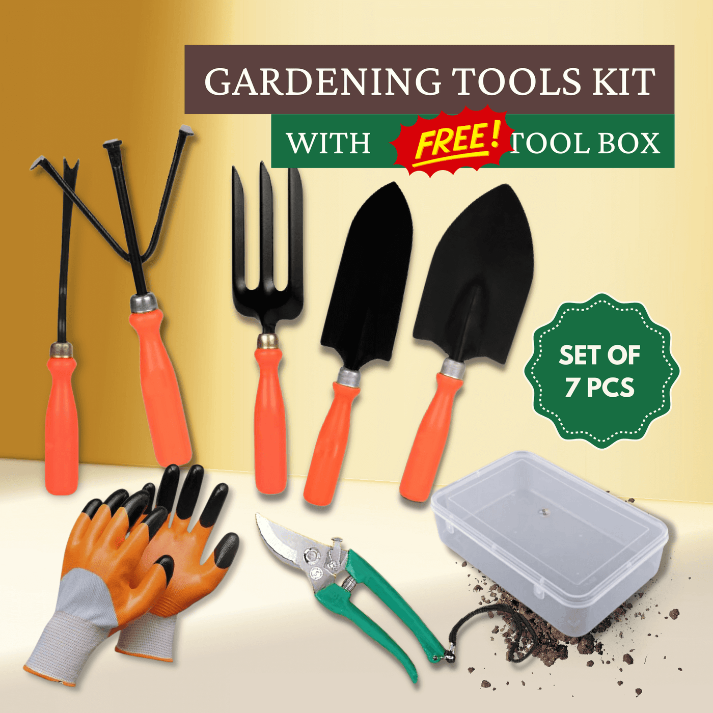 Contents- 1 Hand Cultivator, 1 Hand Fork, 1 Big Hand Trowel, 1 Small Hand Trowel, 1 Hand Weeder, 1 Pair of Garden Hand Gloves, 1 Pruner Cutter, 1 Tool box