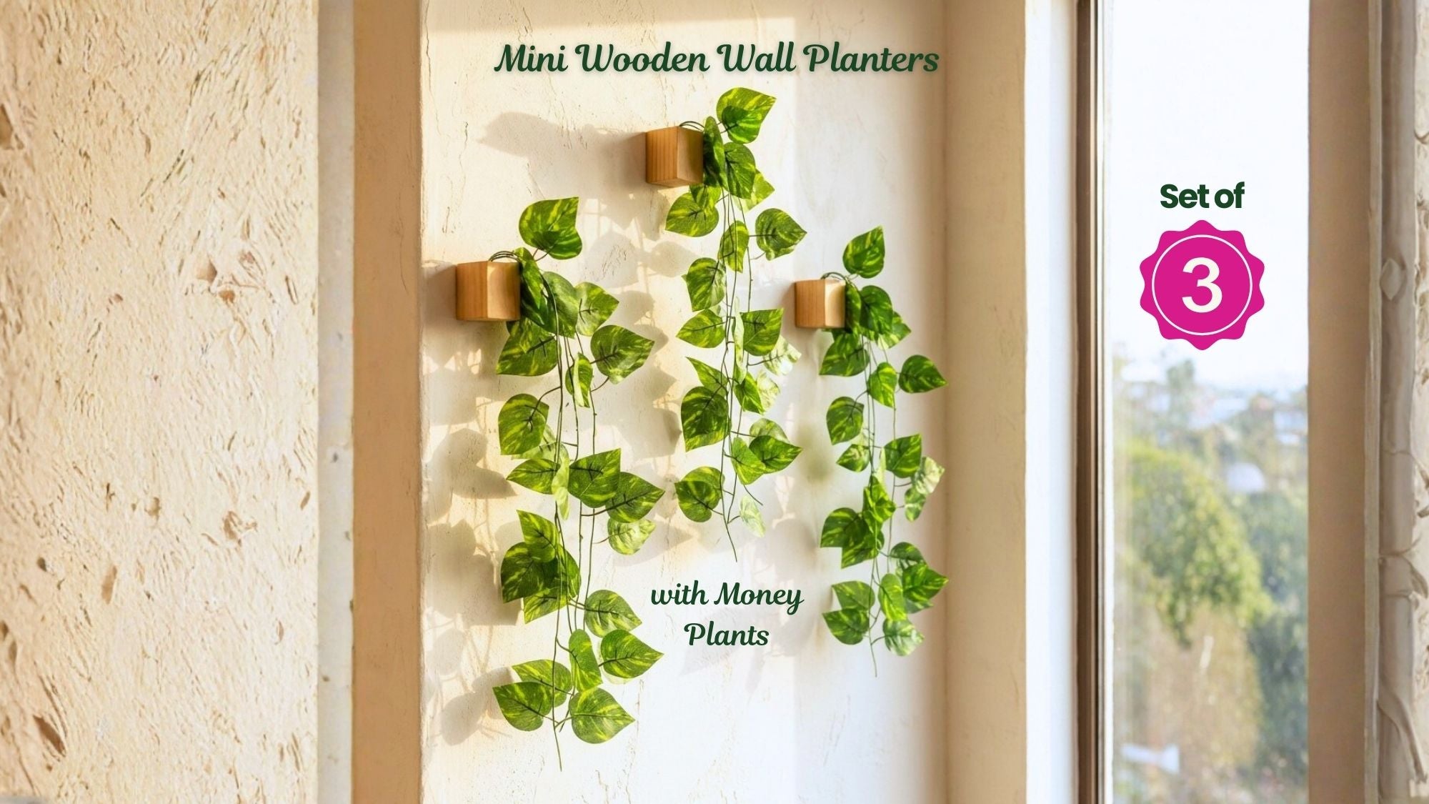 Mini Wall Wooden Planter with Money Plant - 3 pieces